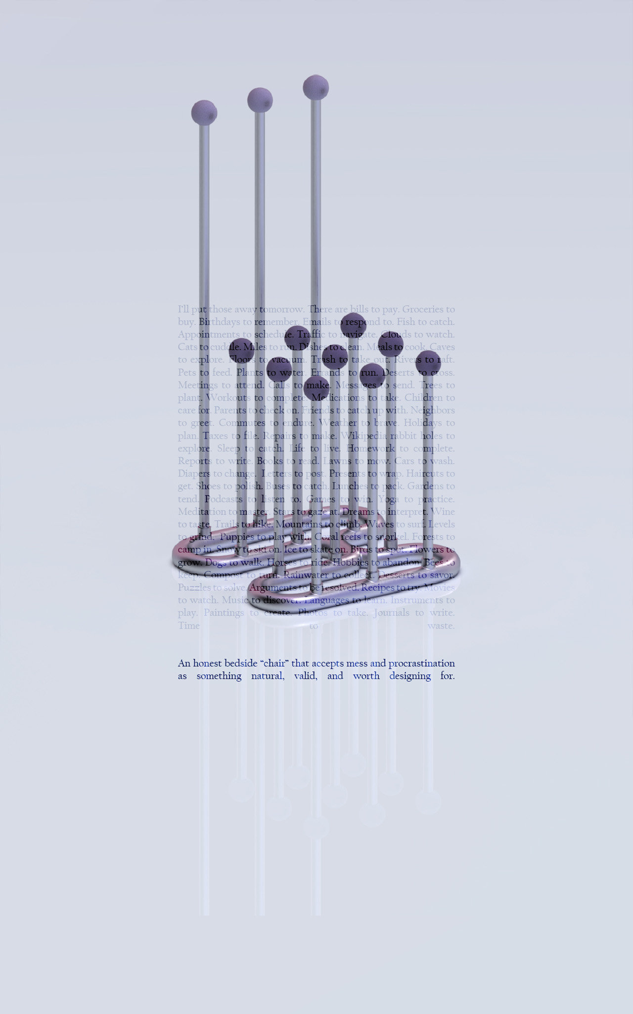 Inspired by the habit of lazily tossing clothing onto bedroom furniture until it becomes unusable in its designed function, this bedside “chair” accepts mess and procrastination as natural and valid parts of our busy lives. Designed to function honestly according to typical real world use rather than intended use, the structure actually becomes a more viable seat as it is “misused” and clothing is piled on.